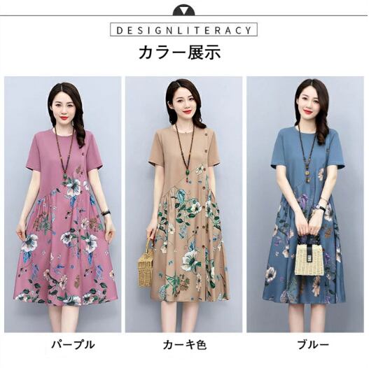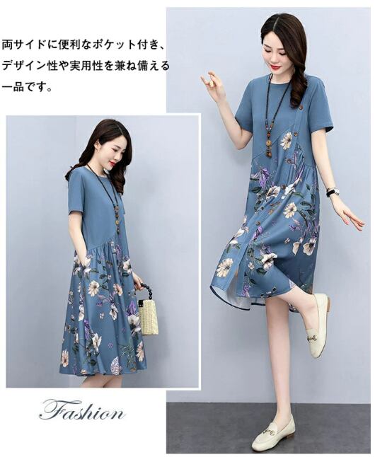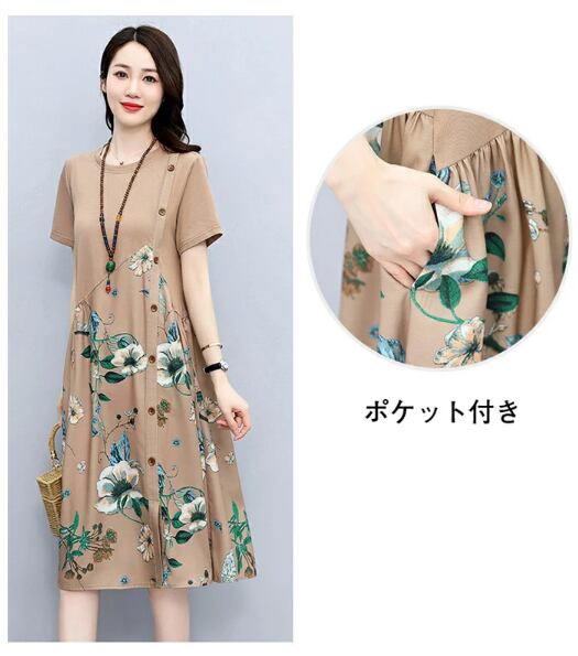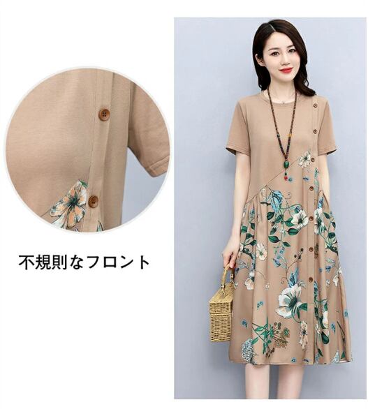 ワンピース レディース 花柄 ワンピース Aライン 半袖 膝丈 ロングスカート 丸首 サマードレス チュニック ボタン 体型カバー エレガント ゆったり カジュアル 大きいサイズ 50-70代 M-4XL