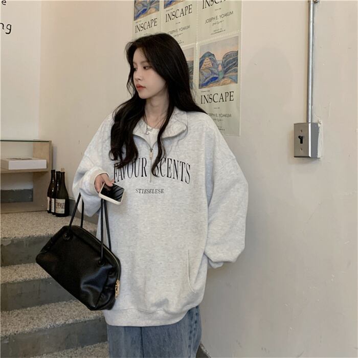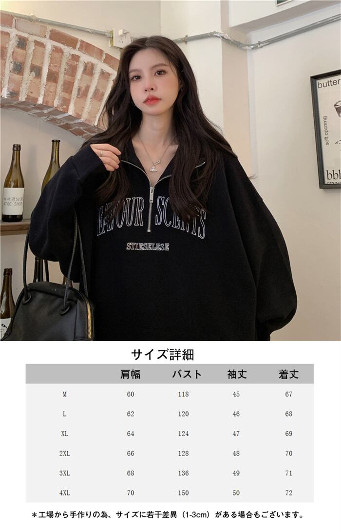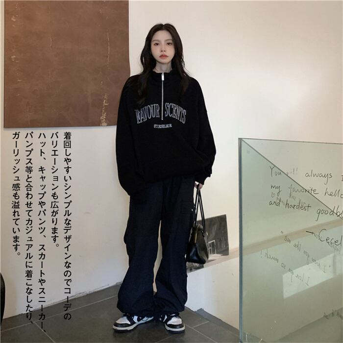 ハーフジップ パーカー レディース トレーナー 長袖 ハーフジッパー シンプル ゆったり 韓国風 ファッション プリント ストリート系 体型カバー ドロップショルダー ビッグシルエット トップス お出掛け M-4XL