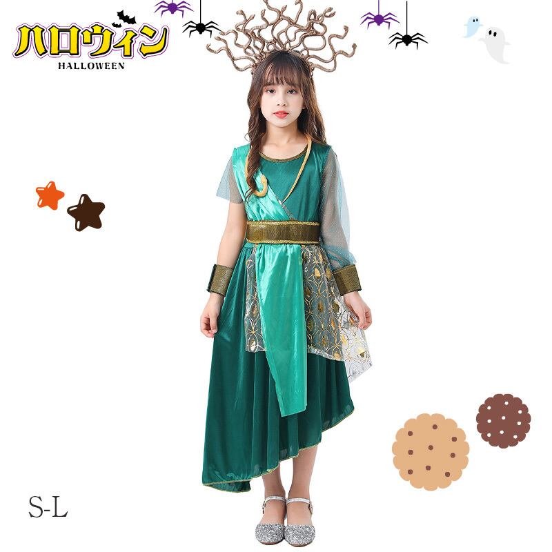 2024新登場 ハロウィン 女の子メドゥーサ 魔女 髪飾り ワンピース 蛇 コスチューム 衣装 仮装 キッズ Halloween変装 文化祭 学園祭 お誕生日 プレゼント クリスマス 舞台 演出服 S-L グリーン