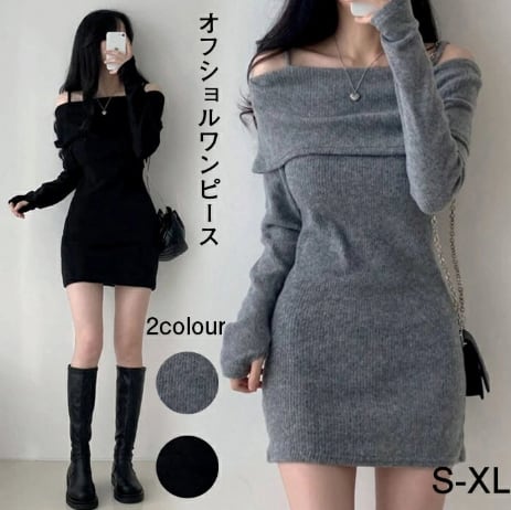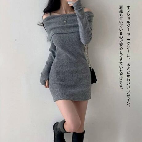 オフショルダー ニット タイト ミニ ワンピース セクシー チュニック ワンピ 長袖 肩出し かわいい レディース ロング 肩紐 付き 黒 グレー S-XL