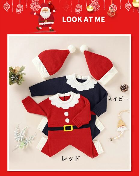 クリスマス ベビー服 新生児 カバーオール 着ぐるみ ニットセーター 赤ちゃん ロンパース ニット帽子付き 幼児 子供 長袖 保育園 ジャンプスーツ 出産祝い 男の子 女の子 百日祝い 妊婦 聖夜 撮影 写真プレゼント 冬 秋 レッド ネイビー