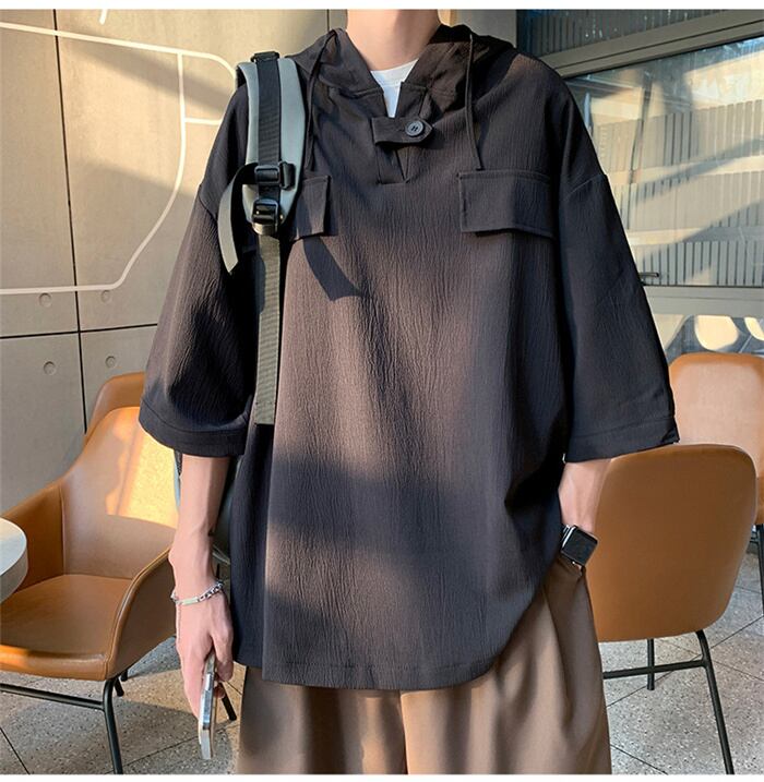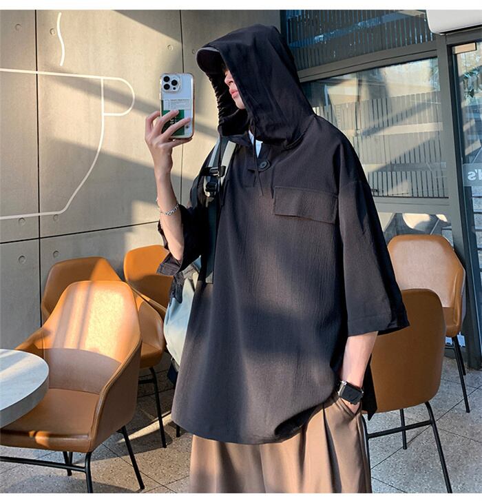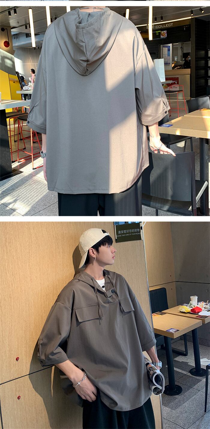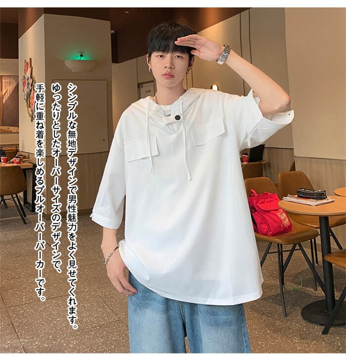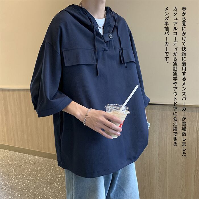 パーカー メンズ 七分袖 春夏 無地 薄手プルオーバー おしゃれ フード付き ゆったり 大きいサイズ 黒 白 グレー ネイビー M-3XL