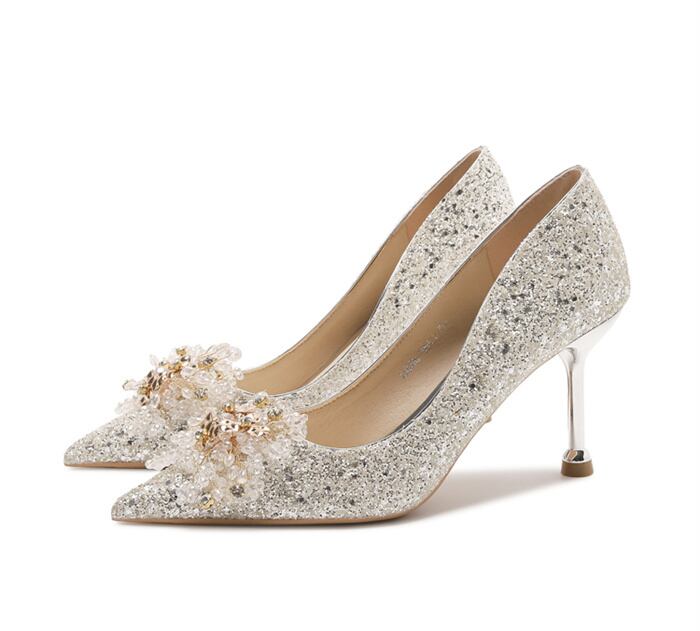 グリッターラメがキラキラ華やかに輝くポインテッドパンプス。<br>