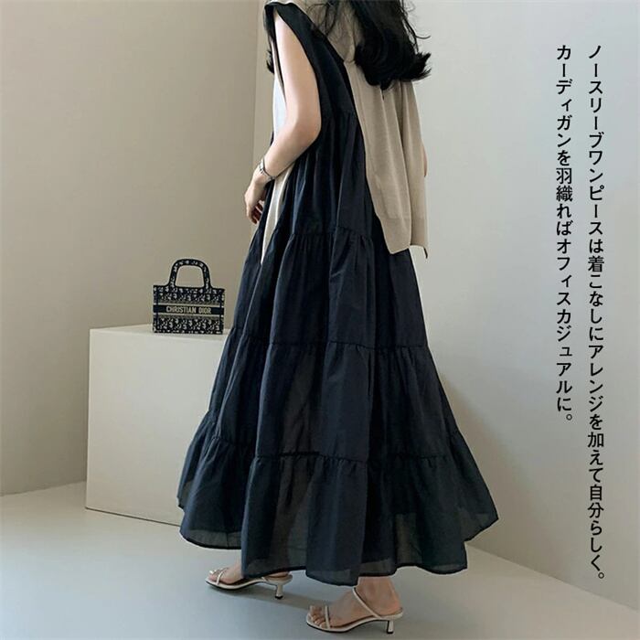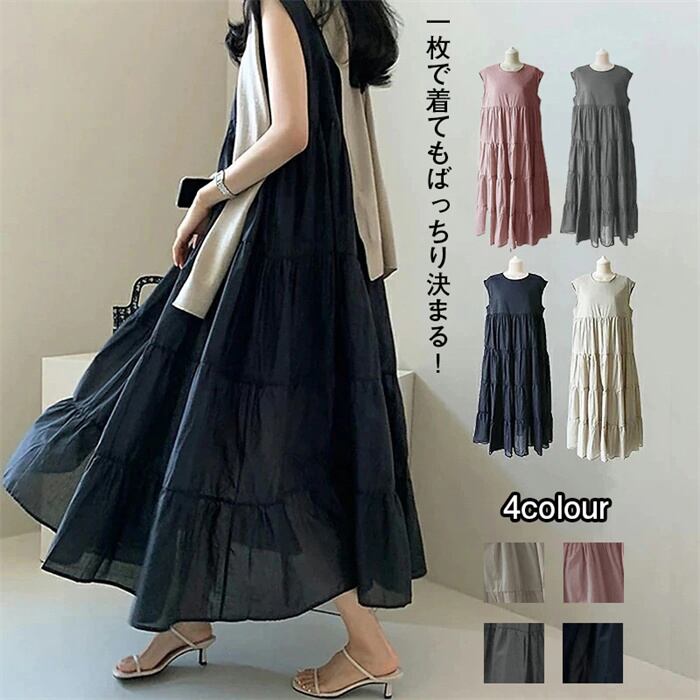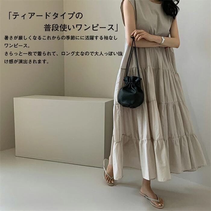 ワンピース レディース 夏 きれいめ ロング Aライン ノースリーブ 丸首 サマードレス チュニック 体型カバー エレガント ゆったり カジュアル 20代 30代 40代 フリーサイズ