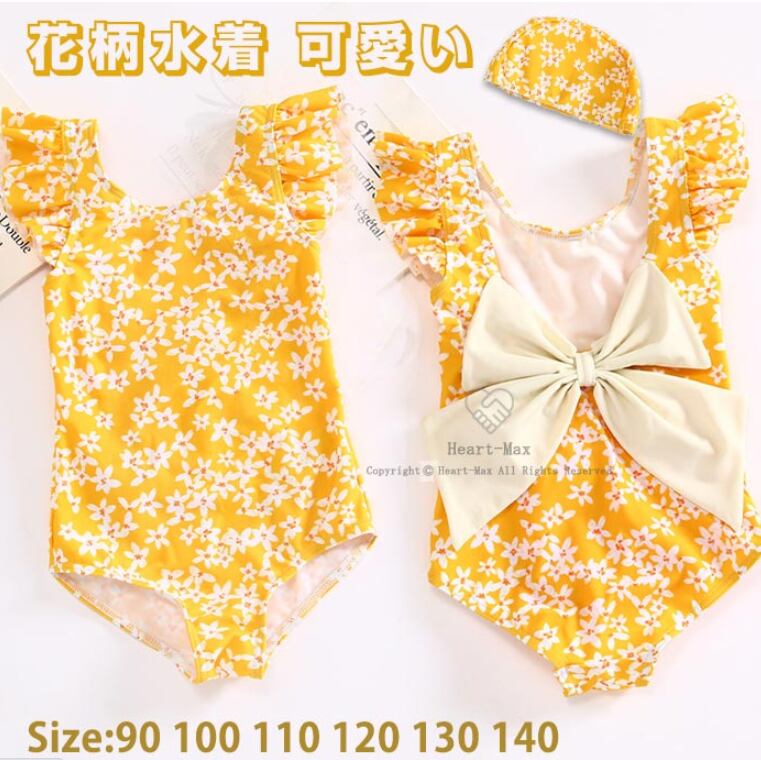水着 女の子 子供水着 ミズギ 子供服 ガールズ ワンピース 花柄 蝶ネクタイ ジュニア スクール水着 ワンピース水着 水泳帽付き スクール プール 温泉 ビーチ 海遊び 可愛い ふんわり お洒落 ゆったり 無地 90 100 110 120 130 140
