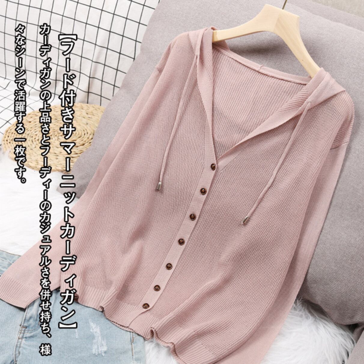 【フード付きサマーニットカーディガン】カーディガンの上品さとフーディーのカジュアルさを併せ持ち、様々なシーンで活躍する一枚です。<br><br>
