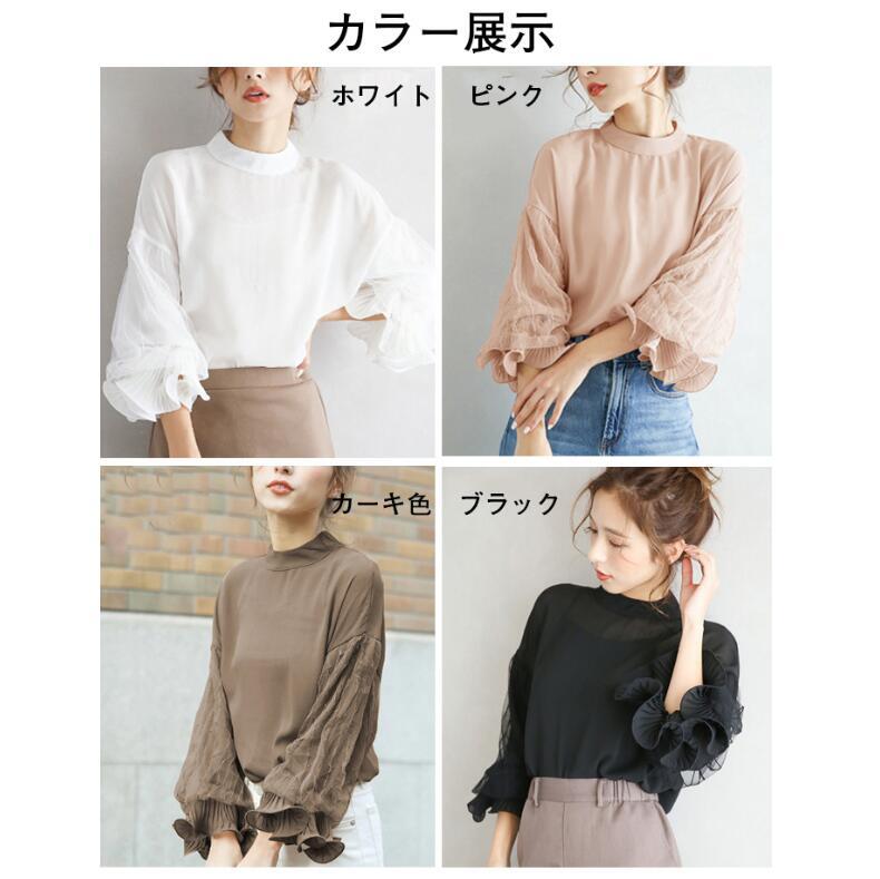 シャツ レディース チュールスリーブ クルネック トップス 長袖 レース チュール 可愛い M L