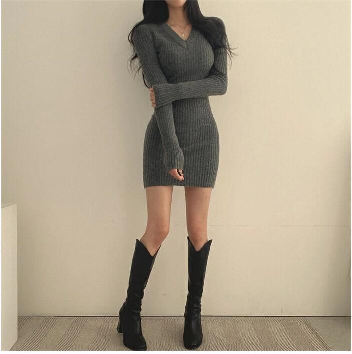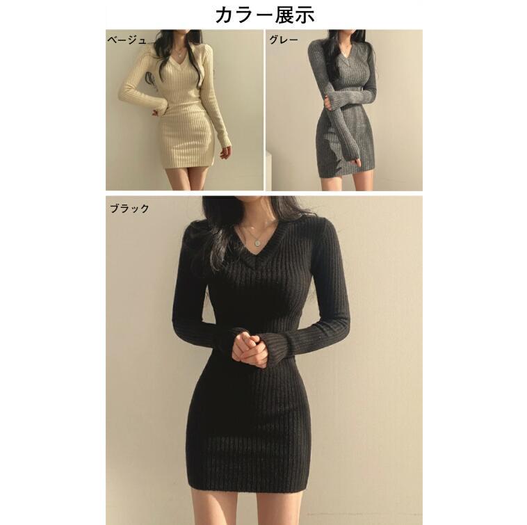 ニット ミニ ワンピース レディース セクシー ワンピース Vネック 長袖 タイトワンピース リブニット 人気 ファッション おしゃれ 重ね着 フリーサイズ