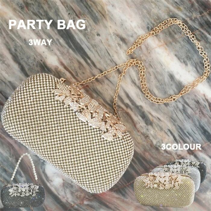 パーティーバッグ ビジュー付きクラッチバッグ 3WAY ショルダーバッグ ハンドバッグ ラインストーン 結婚式 披露宴 二次会 お呼ばれ 演奏会 発表会 シルバー ブラック ゴールド レディース 春 夏 秋 冬 お呼ばれ 他と被らない 短パールチェーン付き ロングチェーン付き