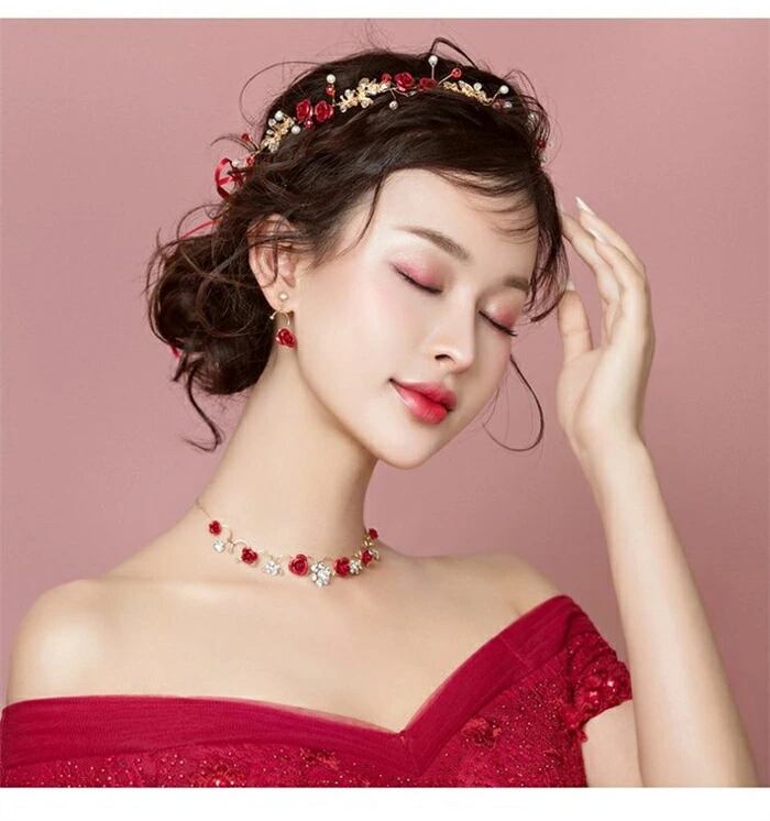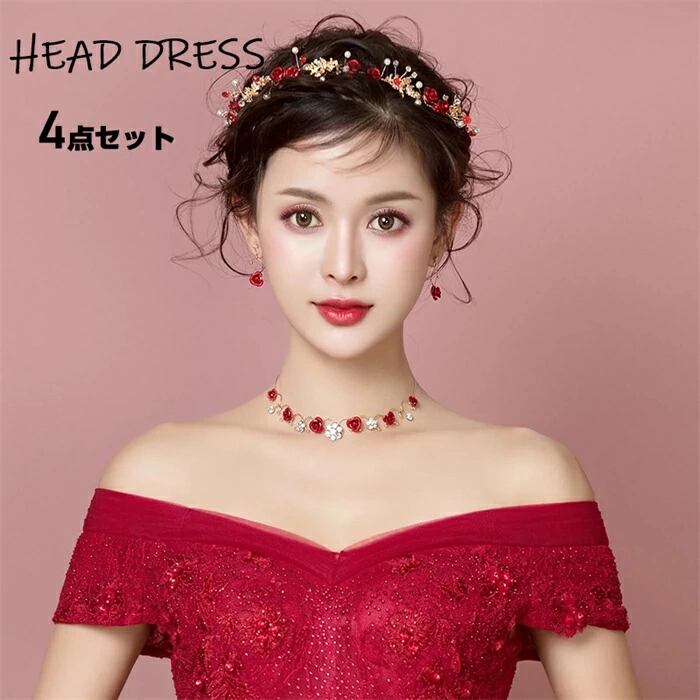 髪飾り 結婚式 パーティー パール 小枝 花 4点セット 花嫁 クリップ ウェディング ストーン 舞台 発表会 成人式 卒業式 ヘアアクセサリー ヘッドドレス ギフト レッド