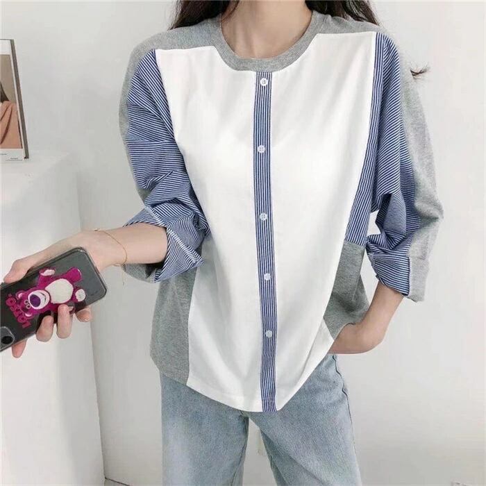 トップス 異素材ドッキングトップス ストライプ レディース シャツ 飾りボタン プルオーバー 大人カジュアル 長袖 フリーサイズ
