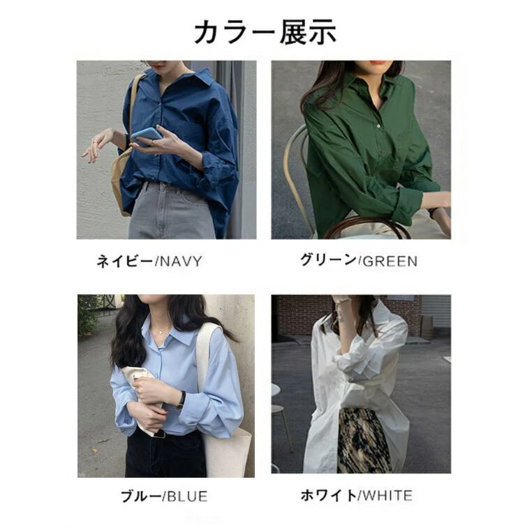 シャツ レディース 長袖 無地 レギュラーカラー シンプル ゆったり 韓国風 ファッション ホワイト グリーン ネイビー ブルー S-3XL