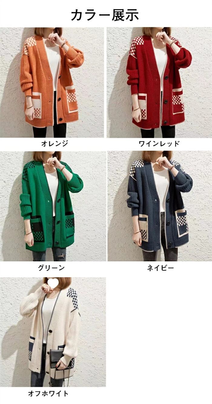 5色展開 カーディガン チェック柄 レディース アウター 長袖 セーター トップス 秋 冬 ネイビー オレンジ グリーン ワインレッド オフホワイト フリーサイズ