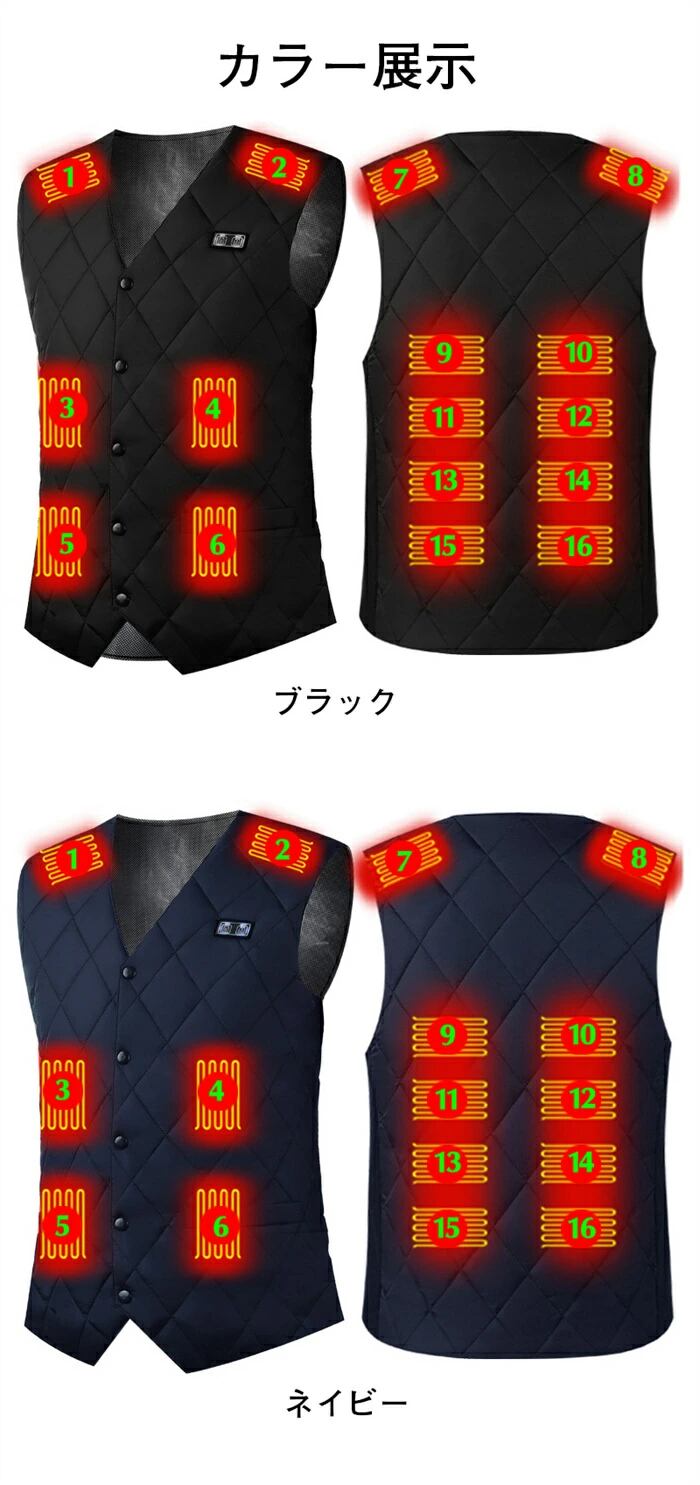 電熱ベスト 加熱ベスト 16箇所発熱 USB給電 ヒートジャケット 日本製繊維ヒーター 急速発熱 洗濯可 3段階前後温度設定 M-6XL