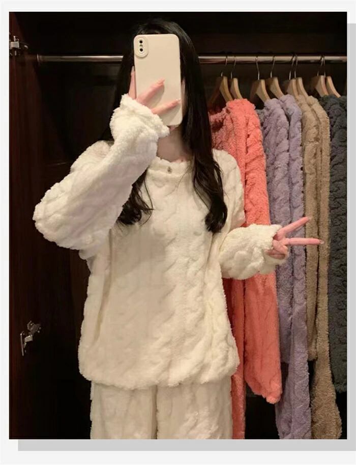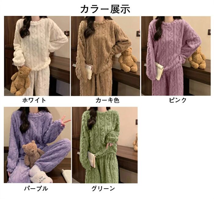 ルームウェア レディース セットアップ もこもこ ふわふわ あったか パジャマ フランネル 可愛い ケーブル柄 女性用 ホームウエア 上下セット 部屋着 室内着 長袖パジャマ 大人 防寒 保温 秋 冬 軽量 プレゼント ギフト フリーサイズ