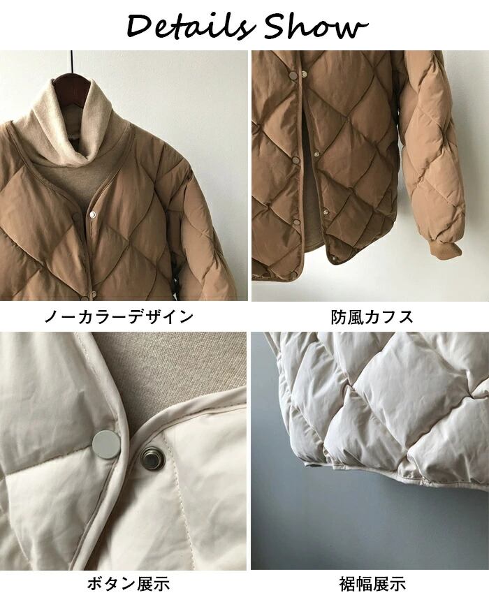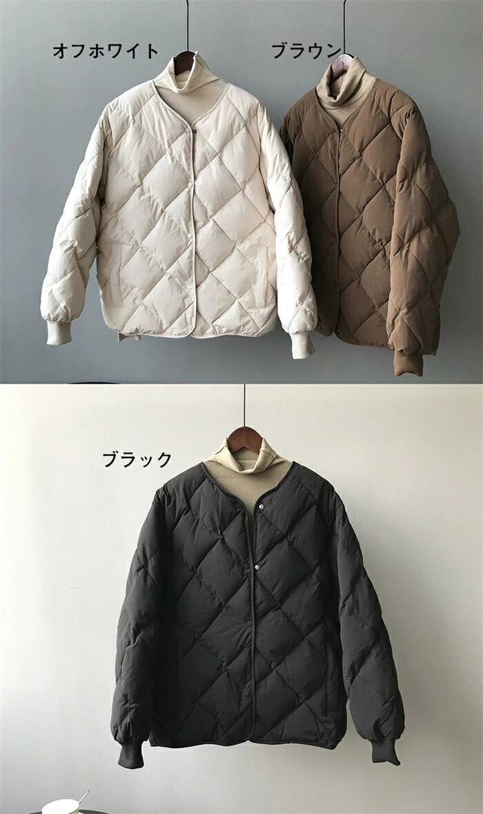 中綿コート レディース ダウンジャケット ノーカラー 軽量 ショート丈 アウター ファッション 秋冬 オフホワイト ブラック ブラウン S M